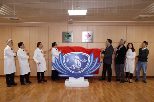 在花蓮慈院林欣榮院長(左四)、吳彬安副院長(左三)、職業醫學科劉鴻文主任(左二)及復健部梁忠詔主任(左一)陪同下,舉行揭牌儀式。