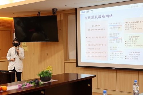 職業傷病診治整合服務中心專案經理王漢珂個管師分享,在職業傷病診治專責醫院有專責個管師提供個案管理、諮詢與轉介服務、通報;以及辦理東區職業病預防相關活動、職業傷病通報與督導等,並與玉里慈濟醫院、關山慈濟醫院一同提供區域職業傷病診治服務,未來將拓展台東馬偕醫院形成綿密的服務網絡,讓有需要的勞工能就近接受診治。
