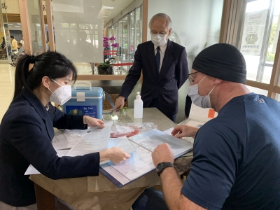 圖:瑞典取髓人員Stephan仔細核對資料,在花蓮慈濟醫院停留的時間不到一小時。取髓任務將近二十小時的飛行航程。慈濟骨髓幹細胞中心主任楊國梁(右圖左一),親自將造血幹細胞交接給瑞典取髓人員,此為新冠肺炎Covid-19疫情邊境管制鬆綁後第一次海外取髓任務。