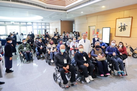 右圖:在慈濟醫療志業脊髓損傷醫療重建中心成立記者會中,來自臺灣各地的脊損傷友一早便已完成報到,和郭漢崇副執行長合影。