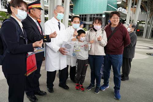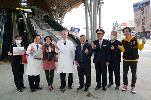▲不少民眾搶著與林俊龍執行長(左三)、林欣榮院長(右三)、臺鐵花蓮站站長楊舜安(左二)合影。