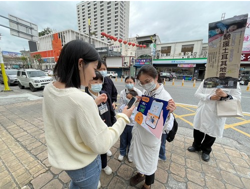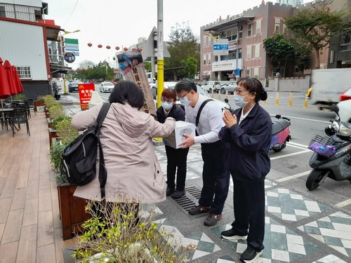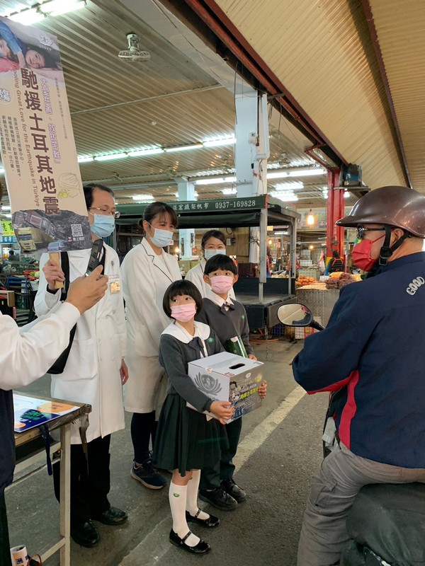 ▲牙科部特殊需求者牙科李彝邦主任(左)與財務部張素鳳主任,進入果菜市場跟民眾講救援土耳其震災歷史與意義。