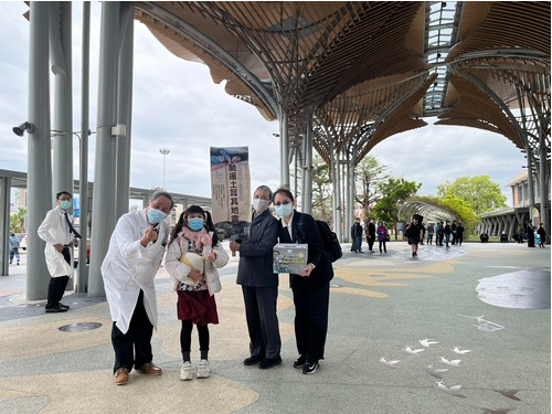 ▲感受慈濟大愛,投考慈濟護專、並接受 上人撥穗,楊小姐對 慈濟幫助土、敘全球共善行動、四海一家精神所感動,她表示過去從事護理工作18年,現在準備轉幼教業,把愛心帶給更多小孩。慈濟護專校友楊小姐(左三),看到慈濟醫療法人林俊龍(左四)、花蓮慈院院長林欣榮(左二)、臺鐵花蓮站站長楊舜安(右三)、花蓮運務段吳金添段長(右四)、花蓮縣衛生局長朱家祥(右一)、副院長陳星助合影。