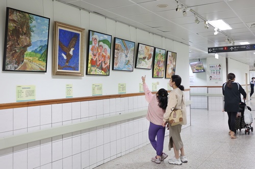 ▲花蓮慈院門診一樓走廊同時展出多位脊髓損傷者以生命一筆一筆繪出的畫作,吸引親子駐足欣賞。(攝影/江家瑜)