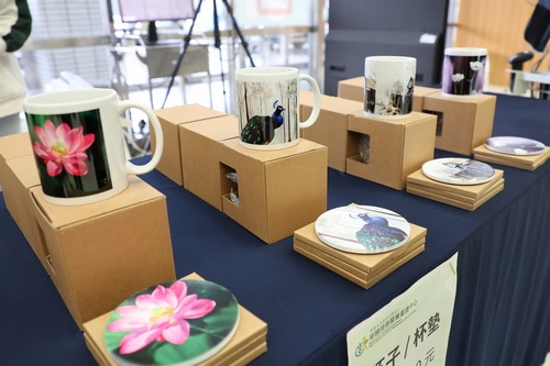 ▲圖說:展出畫家中,馮小姐也繪製了馬克杯及杯墊參與盛會,馮小姐說:「當我專心的沉浸在畫作創作時,我可以忘記身體的疼痛。」(攝影/江家瑜)