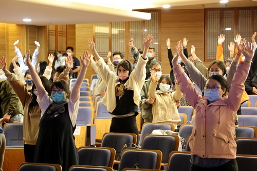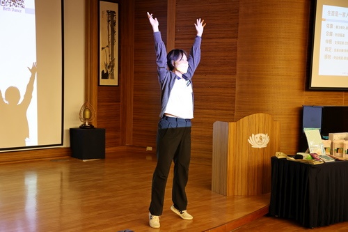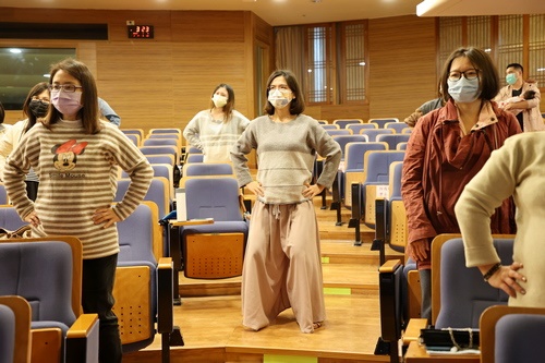 ▲王淑芳助產師示範延展姿勢,現場的爸爸媽媽們也一起跟著運動。