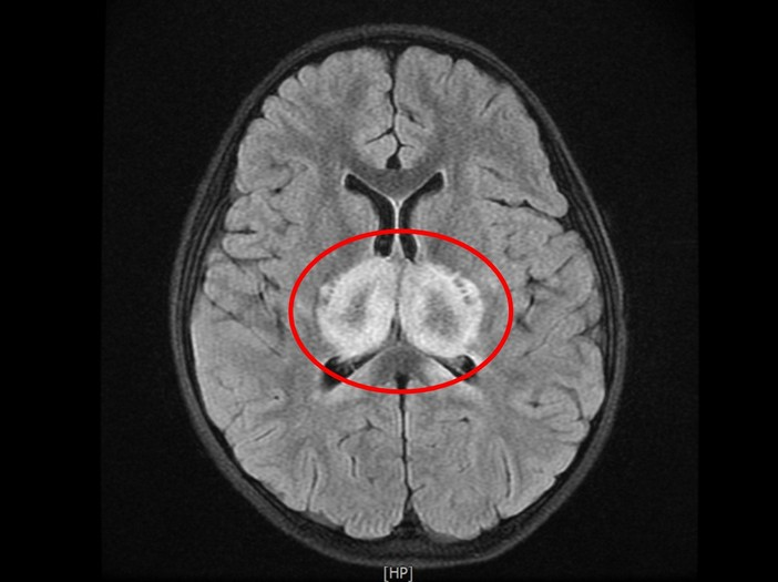 ▲蔡小妹核磁共振掃描影像顯示視丘區域發白,即此區塊正嚴重發炎。