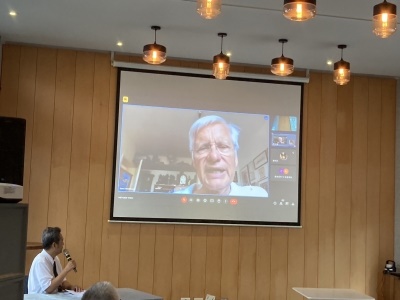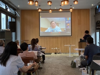 ▲花蓮慈院婦產部主任丁大清在東臺灣婦產科臨床學術夏季研討會現場與從德國連線的Tinneberg教授,以線上直播的方式來介紹氩氣刀(Argon plasma coagulation, APC)