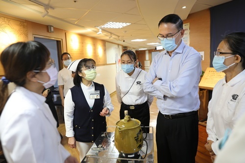 ▲張俰賓博士與新加坡慈濟基金會主管參訪花蓮慈院中醫病房,由總醫師與病房護理長介紹如何利用煎藥壺為患者薰藥治療。