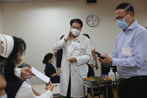 ▲張俰賓博士與新加坡慈濟基金會主管至花蓮慈院中醫門診,觀摩中醫部針灸科主任林郁甯為患者針灸治療,並用手機拍照記錄細節。