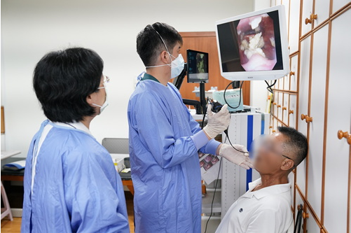 以61歲的病人蔡先生為例,他在十三年前罹患鼻咽癌,經過放射線治療與化療後症狀緩解,最近發現有喉嚨無力,喝水容易嗆到等吞嚥上的困擾,講話的舌頭靈活度也大不如前,於是來看吞嚥障礙特別門診。葉映廷說,經以纖維內視鏡吞嚥檢查後,發現他還沒咀嚼咽部就有口水堆積,而且會咽軟骨敏感度不佳,容易嗆咳;檢查過程也指導他如何調整姿勢、作喉部肌力訓練,例如他在頭後仰時水吞得比較乾淨,建議他需透過不同姿勢改善吞嚥效果,也應避免濃稠食物。