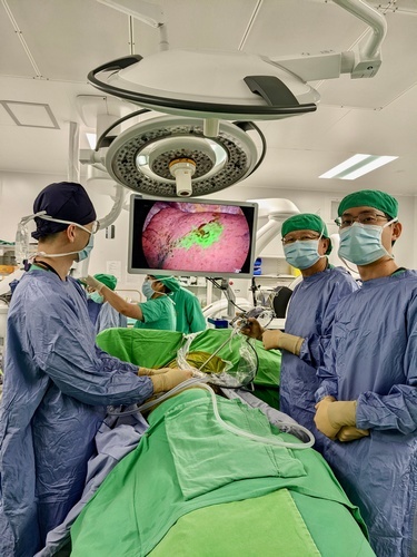徐中平副院長(右二)、鍾秉儒醫師(右一),與洪定醫師(左一),透過靛氰綠ICG螢光影像輔助精準定位,以單孔胸腔鏡為病人開刀切除肺癌腫瘤。(徐中平提供)
