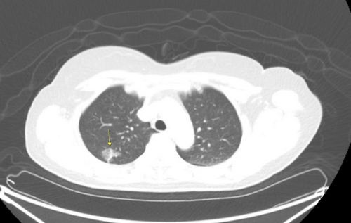 一位46歲女性肺癌病人,沒有任何症狀,一次健康檢查發現0.7公分大的一期肺腺癌腫瘤。以單孔胸腔鏡楔狀切除術切除病灶,傷口僅3至4公分。花蓮慈濟醫院胸腔外科徐中平副院長指出,早期肺炎通常無症狀,提早發現肺癌的訣竅就是做低劑量電腦斷層(LDCT)檢查,建議40歲以上即可自費安排時間做肺部健檢。