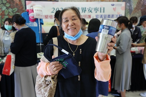 ▲秀出滿滿收穫的楊小姐說,上午剛好來醫院幫先生拿處方箋,很開心能以綿薄之力幫助病人圓滿人生最後的願望,當然要用愛心來支持這活動。