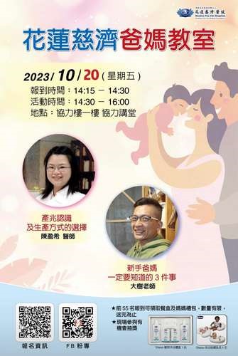 什麼是三大產兆和假性陣痛?自然產與剖腹產的生產流程又是什麼?剖腹產費用較自然產昂貴,是否能申請健保給付呢?為了更詳盡為爸爸媽媽們解惑,花蓮慈院將於十月二十日下午在協力講堂舉辦「爸媽教室」衛教講座,除了有陳盈希醫師介紹產兆與深入分析生產方式優缺點,還有蒙特梭利幼兒指導員大樹老師分享新手爸媽一定要知道的三件事,歡迎有興趣的民眾至「花蓮慈濟醫院婦產部」Facebook粉絲專業瞭解更多講座相關資訊及踴躍報名參加!