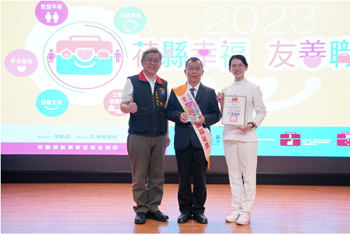 ]花蓮縣政府舉辦第一屆「花縣幸福,友善職場」評選,花蓮慈院以「每位同仁都是我們的『寶』」,在醫、食、住、行、育、樂等六大項目,提升友善職場的品質,獲得「全方位照護福祉獎」的肯定。副院長吳彬安、護理部督導蘇芬蘭、人力資源室主任劉曉諭、李宜芳高專、林逸玨組長、職安室護理師黃子芸、管理師陳怡綺、院長室的蔡椀婷以及長照部的陳鈺潔和林淑緩等人參加表揚典禮。