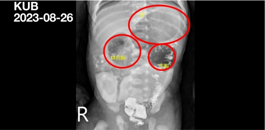 圖:透過腹部X光攝影檢查,可以明顯看見因為腸道閉鎖造成的腸胃道腫大。