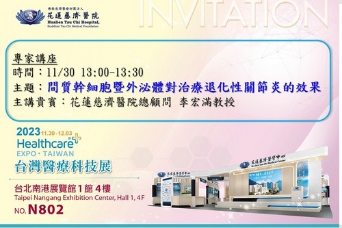 不斷的研發及深入探索生物醫學和再生醫療領域,不僅是為了醫療科技的發展,最重要的是為患者提供更多治療選擇,改善生活品質。李宏滿教授將在11月30日下午1點30分,於台北南港展覽館1館4樓的花蓮慈濟醫院展位(第N802展位)進一步分享「間質幹細胞暨外泌體對治療退化性關節炎的效果」,歡迎有興趣民眾前來了解最新的膝關節治療方式。