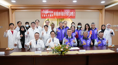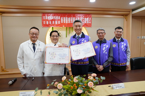 左圖:花蓮慈濟醫院與花蓮縣榮民服務處簽訂《促進退除役官兵醫療照顧合作備忘錄》,由花蓮慈院院長林欣榮(左二)與花蓮縣榮服處處長蕭振嘉(右三)代表簽屬,要提供退除役官兵優質的健康照護,一起健康到老。