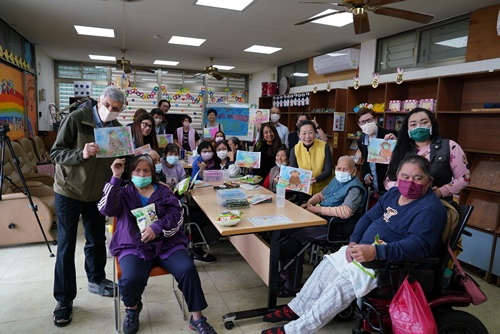 左圖:美國衛生及社會福利部首長及學者代表,在花蓮縣長徐榛蔚(右五)陪同下也熱情參觀日間關懷中心與長者們及其畫作留影。(陳炳宏攝)