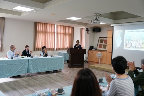 右圖:花蓮慈院自2022年承辦全臺唯一的健保署山地鄉「全人醫療整合計畫」,秀林鄉衛生所田惠文主任分享照顧部落居民執行成果,簡報完獲美國官員一致喝采。(陳炳宏攝)
