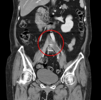清除血栓後,王醫師用血管內超音波檢查,發現有一段明顯狹窄的區域,推測可能是因長期勞動導致椎間盤突出,往前推的脊椎骨壓迫靜脈往腹部大動脈造成「髂靜脈壓迫症候群」;為了維持日後管徑的暢通,在此處靜脈置放支架。