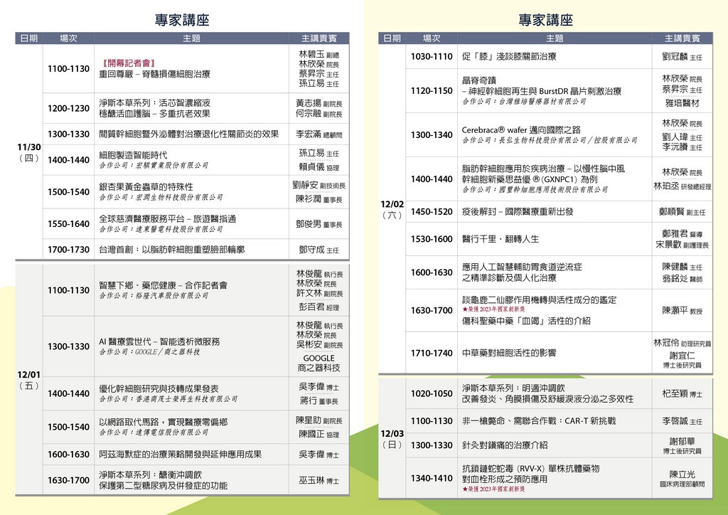 花蓮慈濟醫院在這四天還將推出26場專家講座,主題包括尖端特色醫療(神經幹細胞再生與晶片刺激治療、CAR-T治療)、黃金蟲草研究、中西醫合療創新與系列研究成果、臨床細胞治療新趨勢(腦中風、脊髓損傷、再生運動醫學、美容醫學、智能細胞製造等)、智慧藥箱、智能透析微服務、AI輔助胃食道逆流症之精準診斷及個人化治療、以及獲得2023國家新創獎的「談龜鹿二仙膠作用機轉與活性成分的鑑定」、「抗鎖鍊蛇蛇毒(RVV-X)單株抗體藥物對血栓形成知預防應用」等。2017年開始,國璽幹細胞公司委託執行的脂肪幹細胞新藥思益優治療腦中風已完成二期臨床試驗結果,也將在12月2日的專家講座發表。