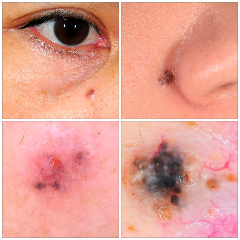 圖:張中興主任表示,左上圖為眼睛附近3mm大小,左下圖為其皮膚鏡放大影像,右上圖為鼻翼5mm大小,右下圖為其皮膚鏡影像,兩者都長得都很像痣,但都是基底細胞癌,應儘早找皮膚科醫師診斷治療。(皮膚部提供)