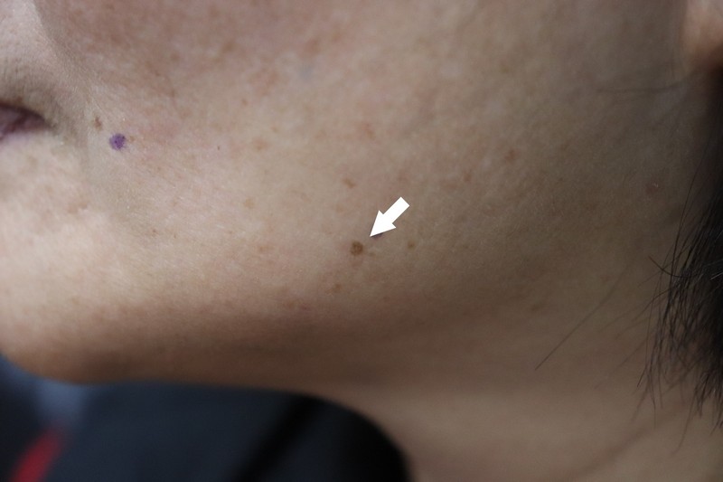 左圖:箭頭所指為花蓮慈院皮膚部的鉺雅鉻雷射除痣前。(皮膚部提供)