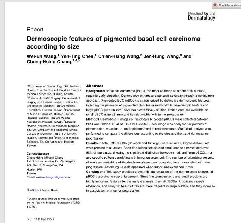 為了儘早診斷基底細胞癌,皮膚醫學中心團隊蒐集了135例基底細胞癌,其中48例小於等於6mm,87例大於6mm,比較兩組表現的差異,建立動態皮膚鏡與腫瘤生長的關聯性,發現有助於更早期診斷基底細胞癌的現象。
