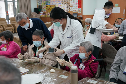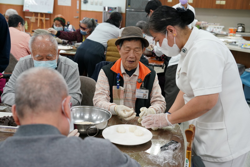 元宵節就是要吃有包餡的元宵。日間照顧整合中心主任張幸齡說,上了年紀長輩,老化退化都是正常的,很多牙口不好,元宵節就擔心他們吃元宵會不會噎到,而且很多老人有高血糖、高血壓、高血脂問題,這次來到的同心圓日間照顧中心,其中的長輩有近九成是失智,還有一成是因為慢性病失能,希望透過節慶活動讓他們懷舊,豐富生活。