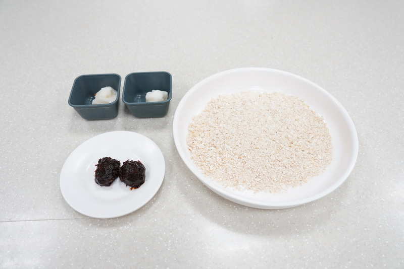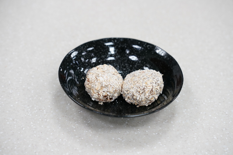 4.把餡料(參考內餡)作法包入後用滾水煮熟放涼後在將堅果碎、燕麥片放在鐵盤上利用