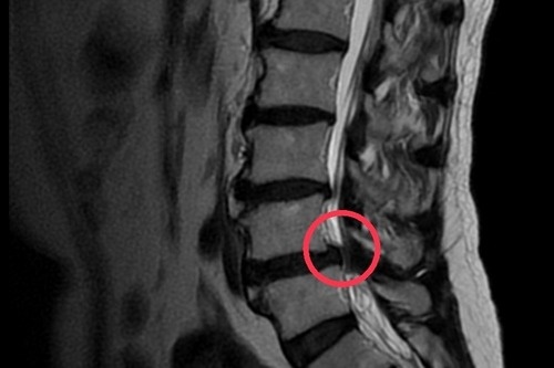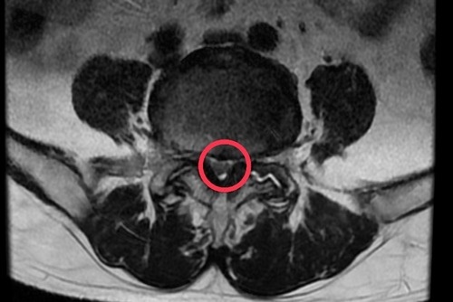 左圖、右圖:磁振造影顯示黃先生腰椎滑脫,神經受到壓迫。