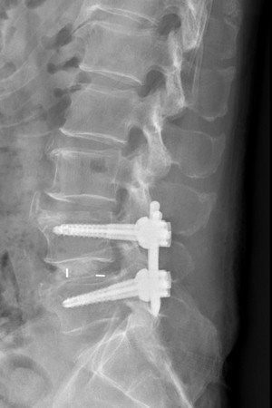 圖:腰椎微創融合手術治療,將鋼釘及支架精準植入,椎間高度與後凸角度恢復良好。