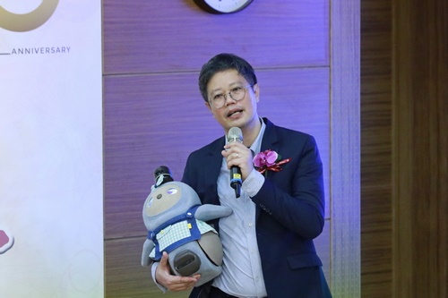 圖說:新加坡社科大學副教授陳正見,以「促進老年人福祉」為主題進行分享,社交機器人Yuuku的可愛模樣吸引所有人目光。 (攝/劉鴻榮)