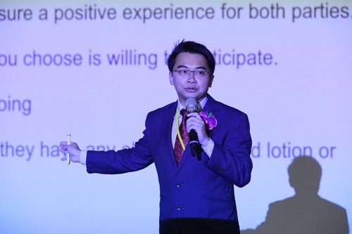 圖說: 新加坡理工大學博士洪成福,分享靈安護理:末期病人治療性照護,並現場示範能安撫病人的膚慰按摩手法。(攝/劉鴻榮)
