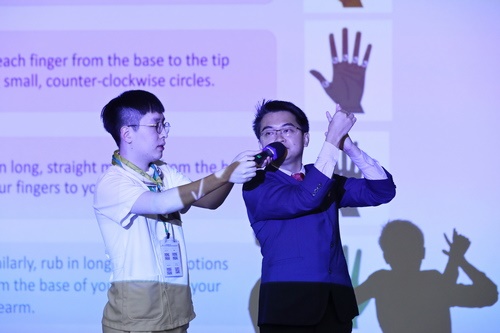 洪成福博士不藏私的分享能安撫病人的膚慰按摩手法,洪成福博士表示,透過專注於尊嚴、舒適和有意義的照護,靈安護理(Namaste Care)能協助提升病人的生活品質,並在這深刻而神聖的過渡期間為他們的家人和照護者提供支持。
