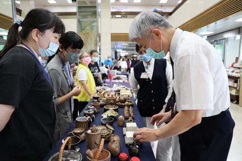 早上8時30分左右,花蓮慈濟醫院大廳展攤以擺滿傷友的作品,包括手作的金縷藝術品、陶藝品、編織包包、手工鋼筆等文創品,以及手工餅乾、咖啡凍、溏心蛋、涼拌素若小黃瓜、滷豆干、滷蛋、饅頭等。深受花蓮慈院同仁及道院的鄉親喜愛。