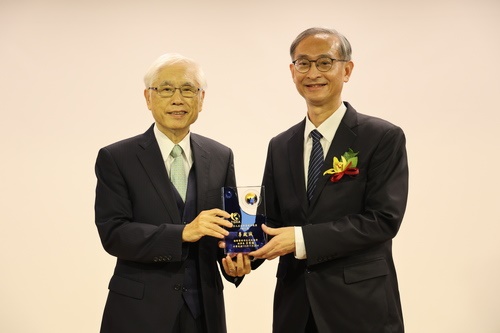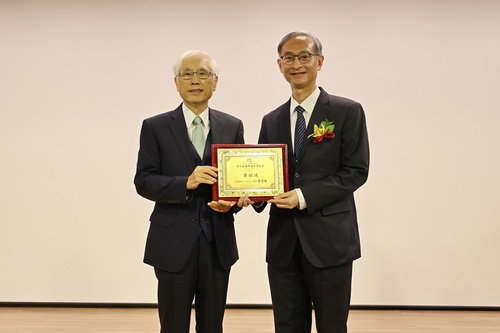 圖說:前衛生福利部部長林奏延(左)頒獎給花蓮慈濟醫院幹細胞與精準醫療研發中心暨國際醫學中心主任李啟誠(右)。(攝/江家瑜)