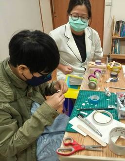 圖說:藝術治療師(左圖)與音樂治療師(右圖)到病房,藉由音樂與手作遊戲,減輕樂樂住院不安的情緒。(攝/樂樂母親)