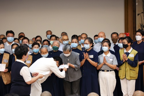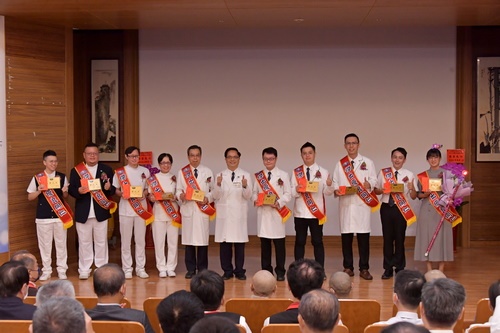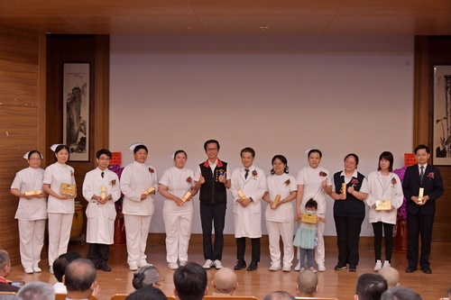 除了醫護、醫技與行政同仁,志工也是醫院中不可或缺的角色,在醫院每個需要服務的角落服務民眾,或在大廳、走廊、門診和病房區域指引和陪伴病患,或走出醫院與居家護理師前往病人家中關懷;從住院期間陪伴病患運動散心,關懷病患與其家屬,到病患順利出院時獻上滿滿祝福,志工就像醫療團隊與患者在醫院的家人,用心付出,時刻給予支持與關愛。院慶大會上,林欣榮院長代表醫院全體同仁致頒感恩卡給志工。