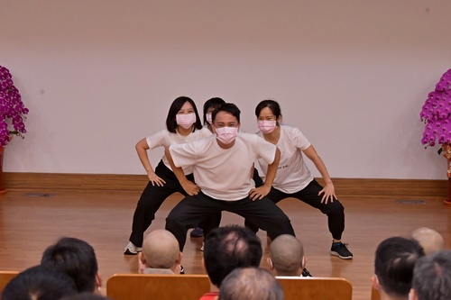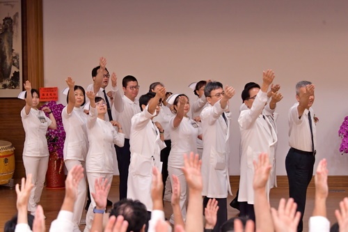圖說:林欣榮院長帶領同仁演繹無量義經大法船,祝福花蓮慈院明年高分通過醫學中心評鑑。
