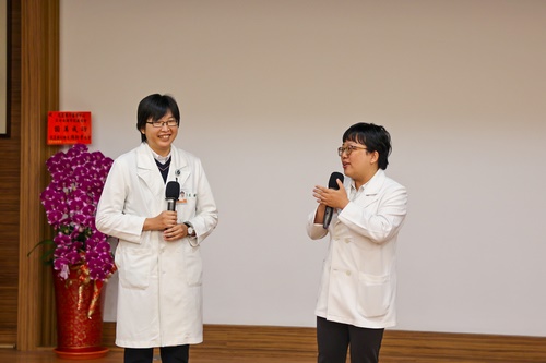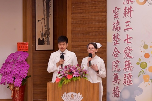 右圖:院慶大會主持人由復健科醫師葉映廷、護理部督導蘇芬蘭擔任。