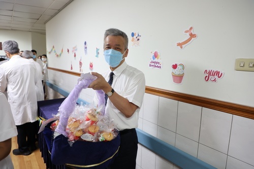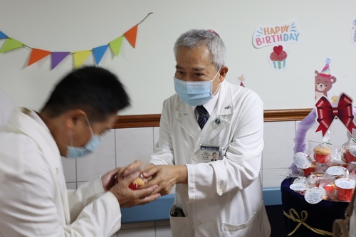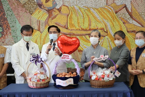 「祝福花蓮慈院生日快樂!」在這幸福與感恩的日子裡,林欣榮院長與人力資源室特別準備了生日小蛋糕,感恩醫療志工擔任慈院的後盾,處處照顧著同仁;近午時分,志工室主任顏靜曦也準備了喜氣洋洋的紅蛋,由林欣榮院長、醫務秘書李毅代表,在大廳與病人及家屬分享院慶喜悅。