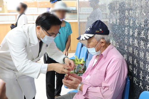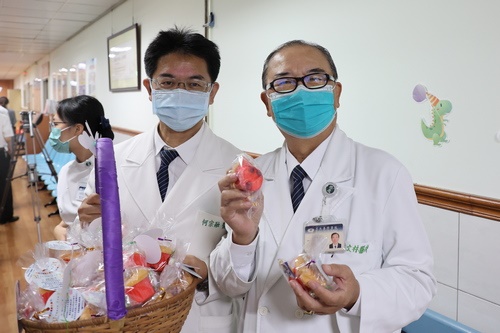 ▲喜氣洋洋的紅蛋,由林欣榮院長(左圖)、醫務秘書李毅(右圖)代表,在大廳與病人及家屬分享院慶喜悅。(攝影/江家瑜)