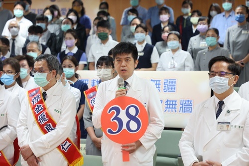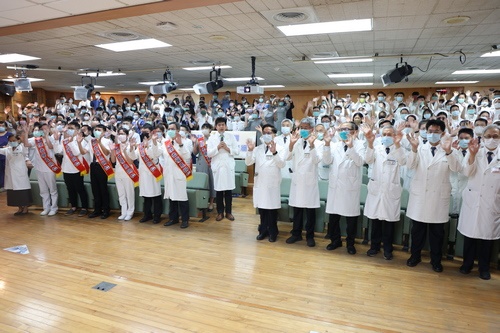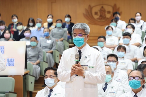 ▲8月17日一早,花蓮慈濟醫院院長林欣榮與超過200位同仁、醫療志工在晨間人文講座上,和全球的慈濟人連線,同步慶祝啟業37周年的生日。(攝影/黃思齊)