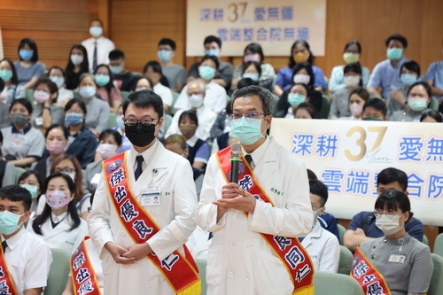 ▲8月17日一早,花蓮慈濟醫院院長林欣榮與超過200位同仁、醫療志工在晨間人文講座上,和全球的慈濟人連線,同步慶祝啟業37周年的生日。(左圖攝影/陳炳宏、右圖攝影/黃思齊)