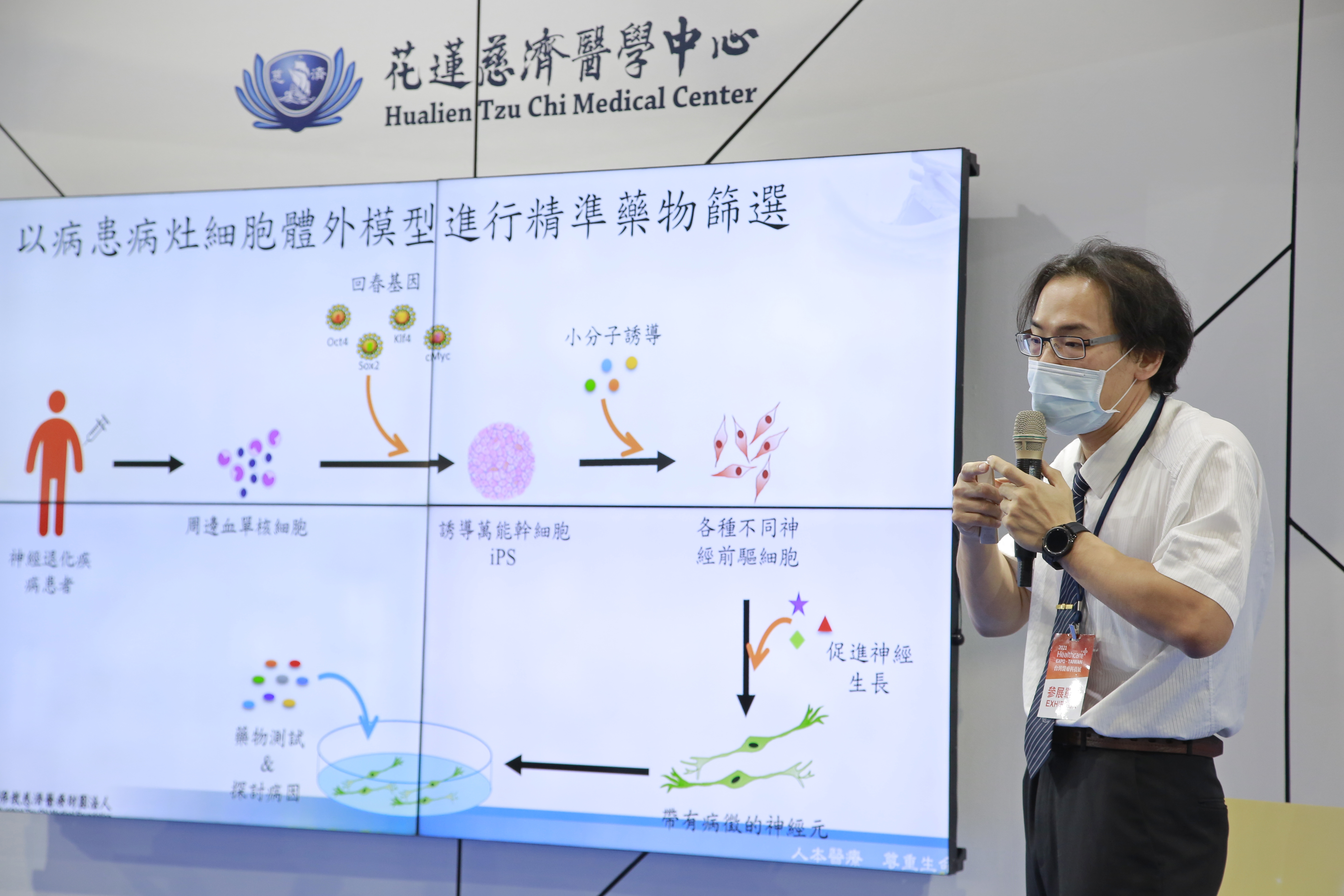右圖:花蓮慈濟醫院院長暨慈濟創研中心研發長林欣榮指出,這不僅有助於惡性腦瘤、漸凍症、失智症等腦部新藥的開發,還包括選擇性去除未分化的多潛能幹細胞的醫藥組合物開發技術、以及一種活化態免疫細胞的體外擴增方法。