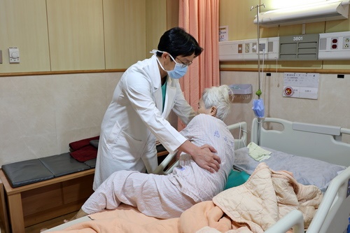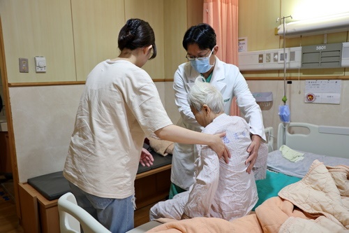 左、中圖:出院前,洪祥益主任特別叮嚀郭奶奶下床時不可以腰部力量起身,應先側身再用手臂撐起上半身,以免受傷。