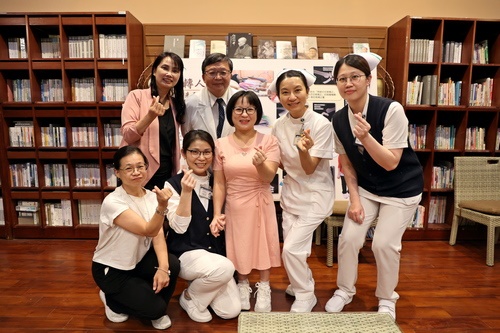 ▲陳團治與陳英和名譽院長、陳玉娟護理長、劉玉玲護理長、許慧英副護理長、厲燕蓉教學小組長、護理師張素芬開心合影,並在團隊陪伴下一起回到病房敘舊。